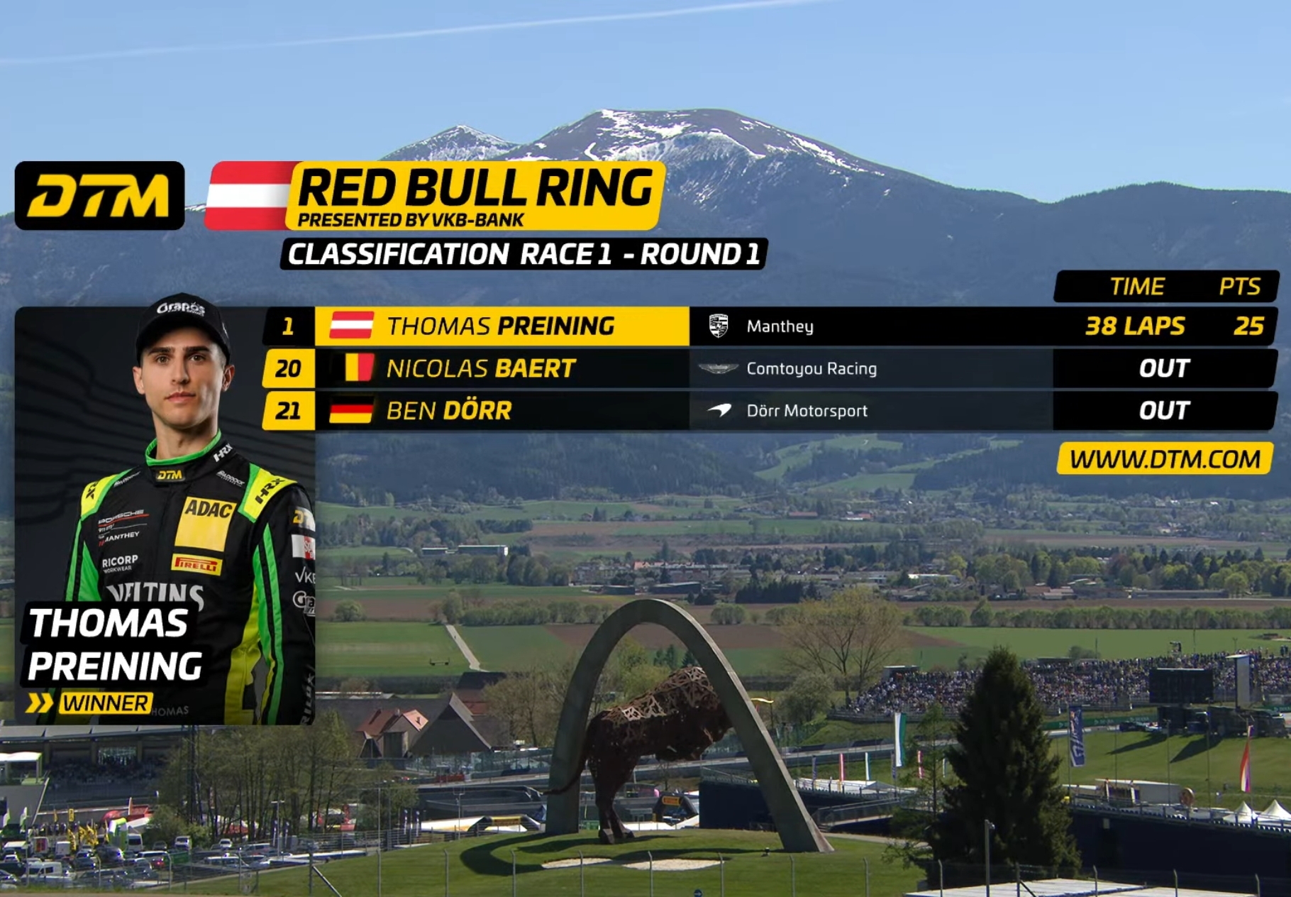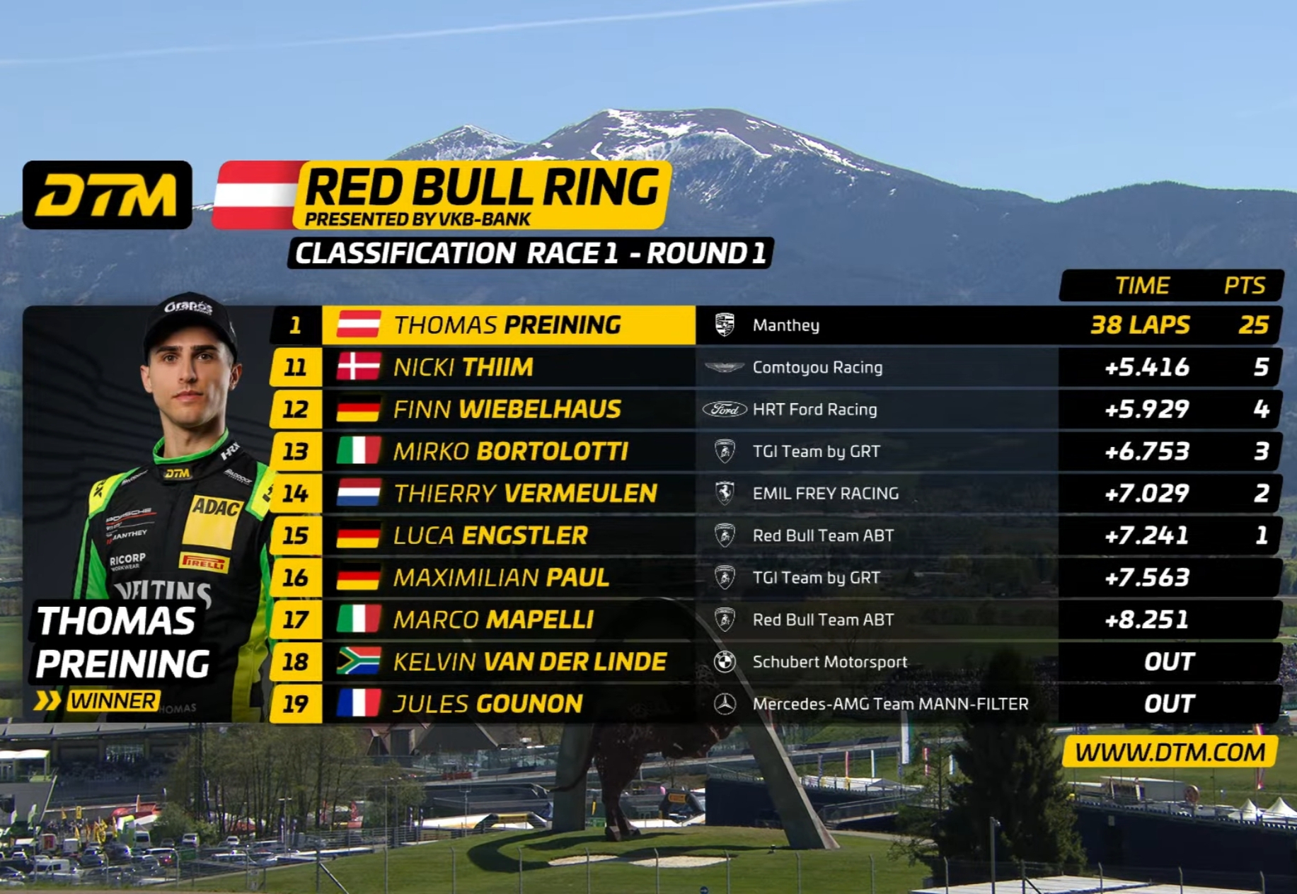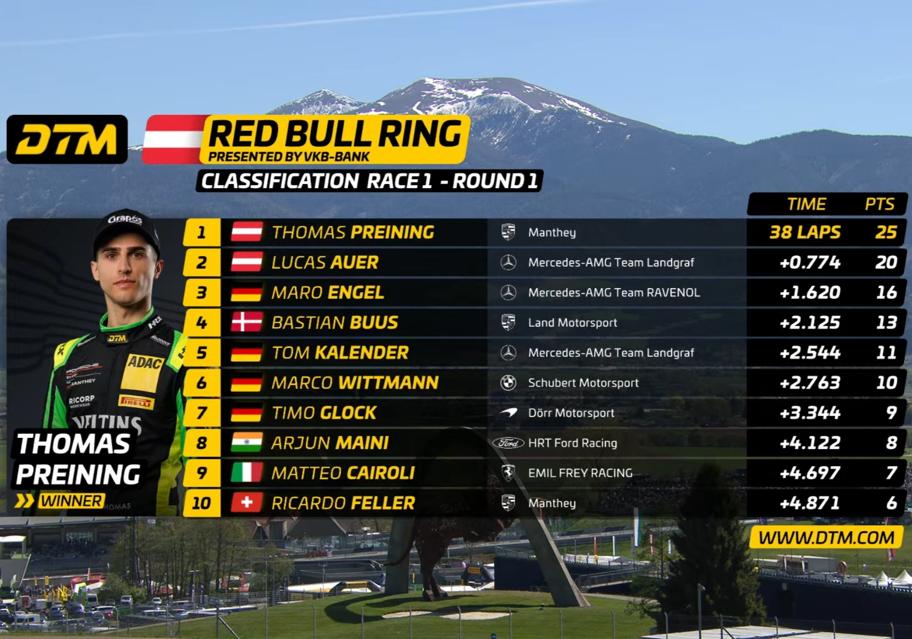První závod letošní sezóny DTM rozhodně nenudil. Po startu z pole position se Maro Engel postupně propadal až za své kolegy z Mercedesu - Lucase Auera a Julese Gounona. Nebyl to ovšem jediný pád, Němec spadl také za Preininga.