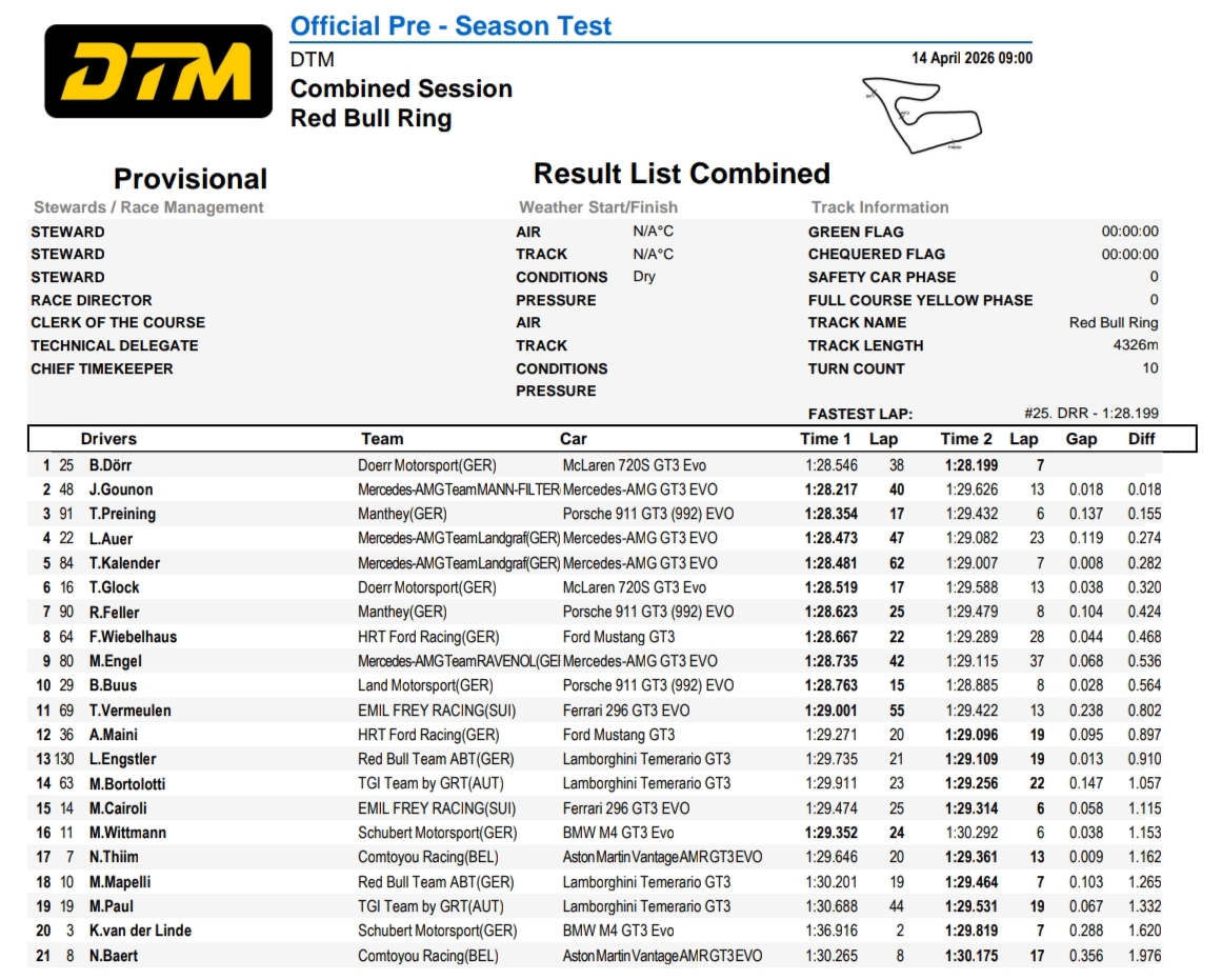 Po více než sedmi hodinách jízdy, z nichž posledních 60 minut probíhalo v mírném dešti, dokončil generální zkoušku DTM Ben Dörr jako nejrychlejší jezdec dne. Jednadvacetiletý jezdec zajel nejrychlejší kolo ve svém McLarenu 720S GT3 Evo s časem 1:28,199 minuty. „Kvalifikační program jsme absolvovali o něco dříve než ostatní týmy. Poté jsme také předvedli dobrý výkon v dešti a oproti loňskému roku jsme dosáhli pokroku. Nová pneumatika se cítí chová a je o něco měkčí. To by nám mohlo v závodech pomoci, protože v minulosti nám po zastávkách v boxech trvalo poměrně dlouho, než jsme pneumatiky dostali do správného teplotního okna,“ řekl Dörr.
