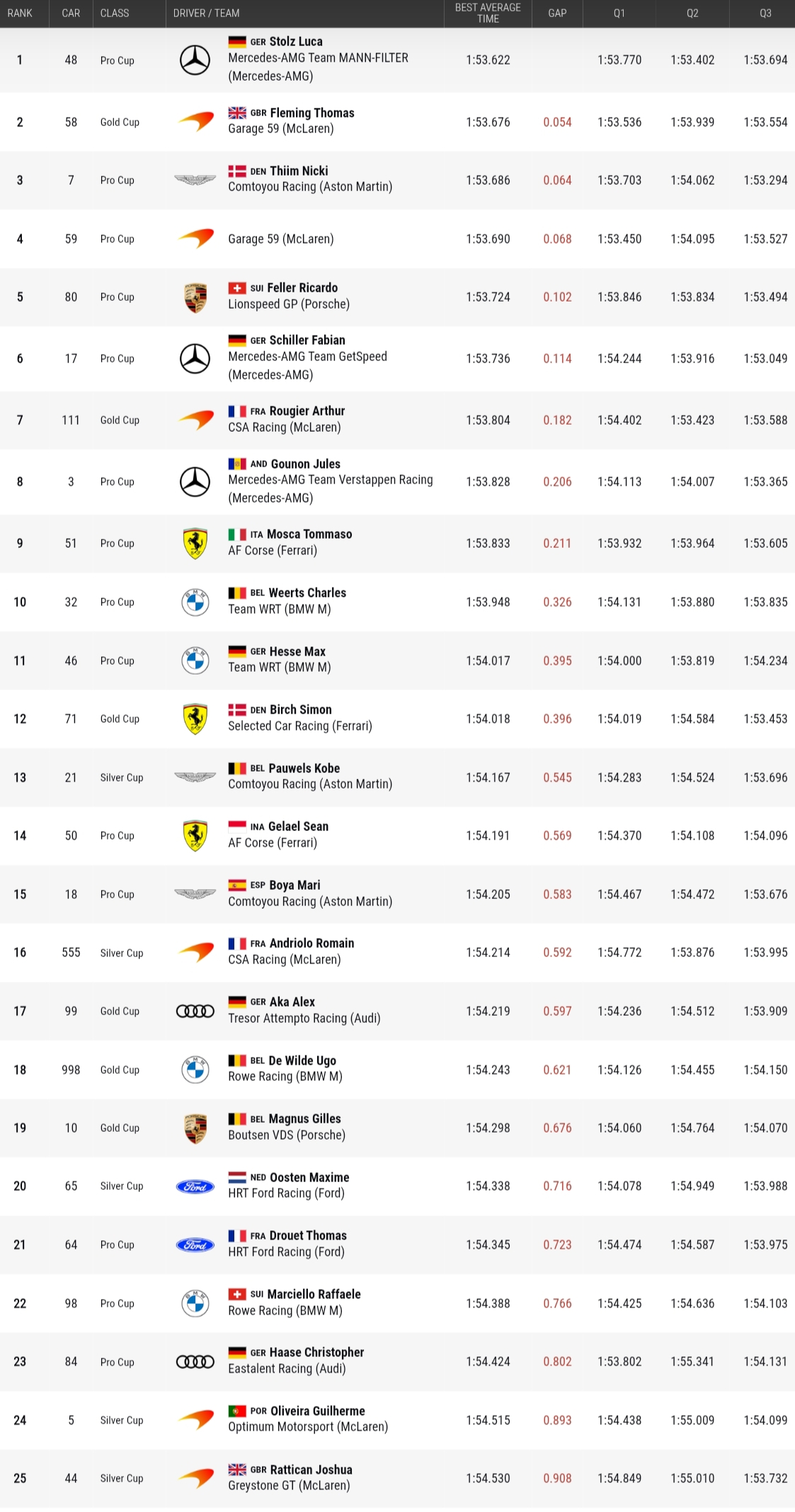 Celkovou pole position slaví Mercedes týmu Mann-Filter v sestavě Luca Stolz, Lucas Auer a Maro Engel.